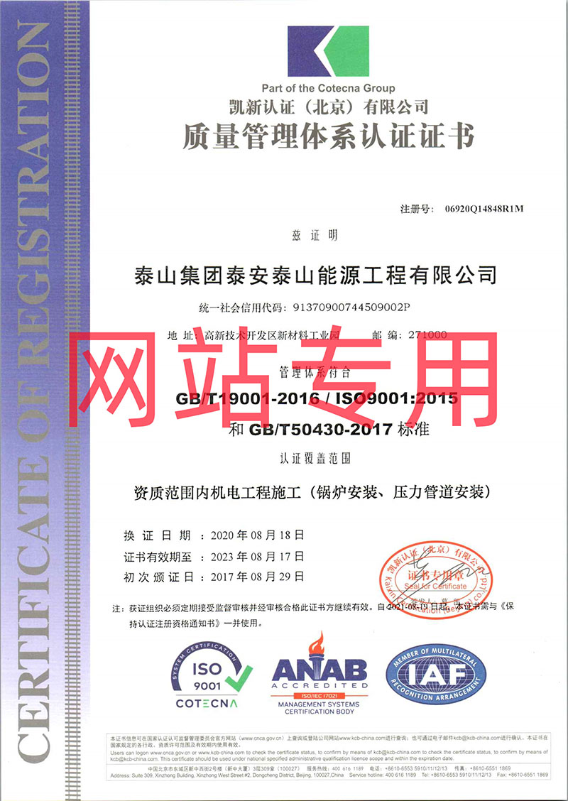 質(zhì)量管理體系認證證書(鍋爐、壓力管道安裝)